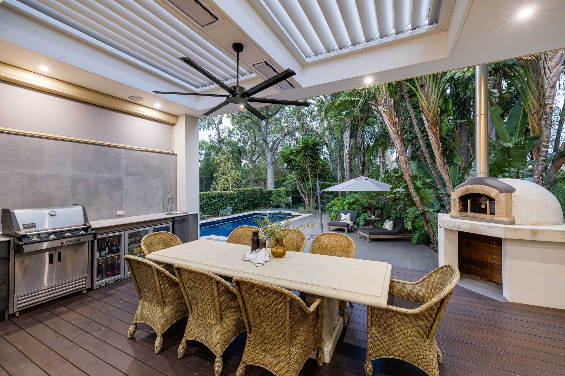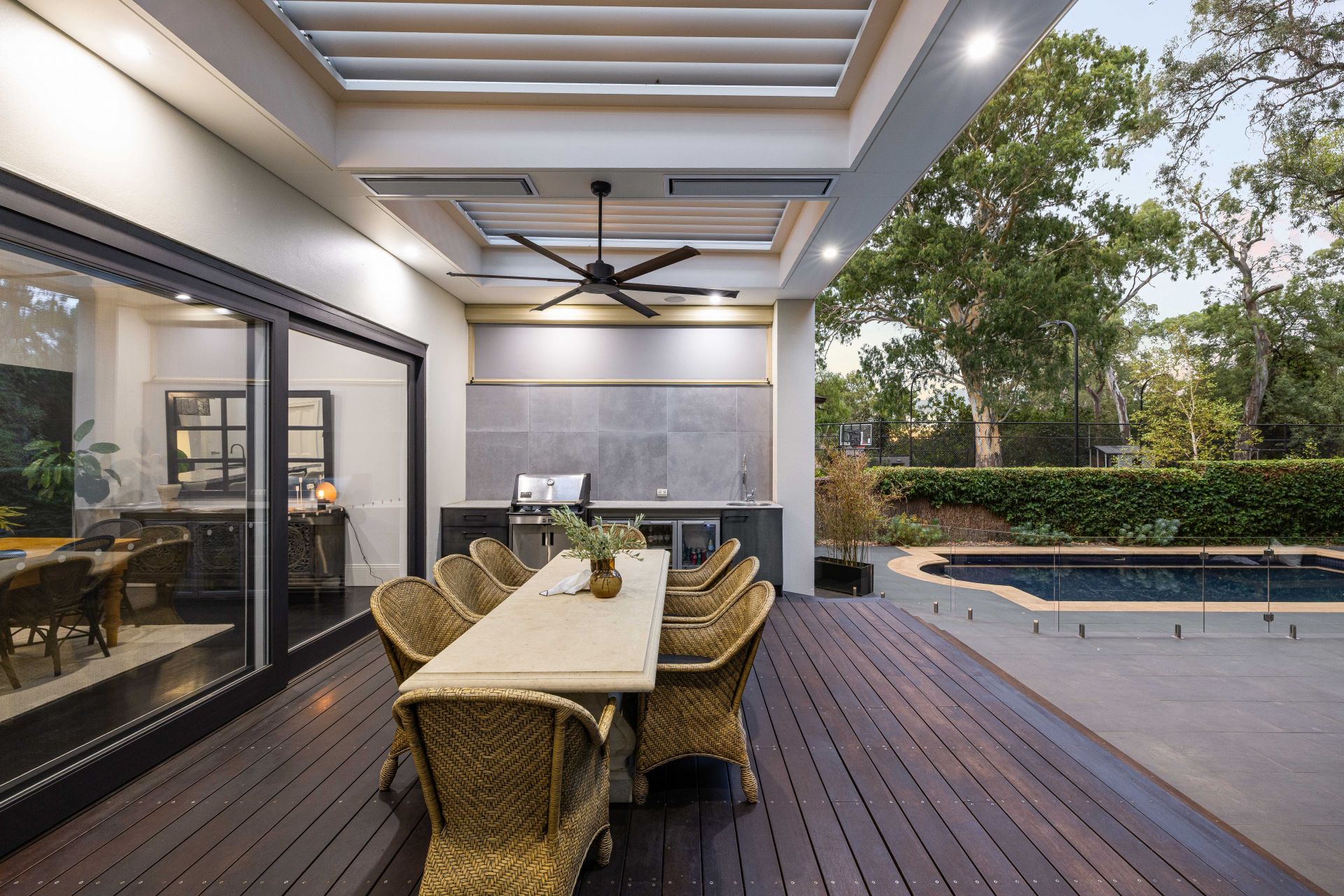 Entertainers Terrace with outdoor kitchen including Weber & fridges, electric ceiling heaters to outdoor area, Vergola panels, roller blind, speakers and mood lighting, large sink with pull-out tap