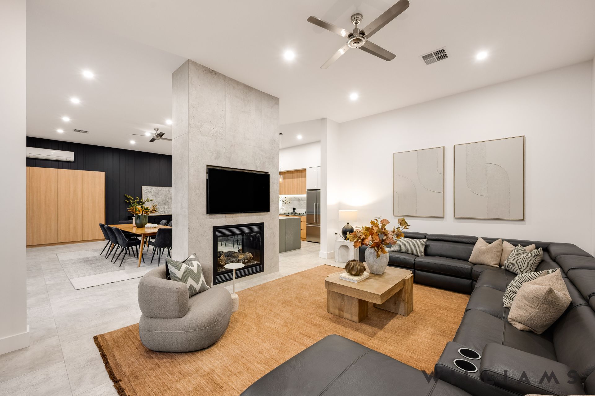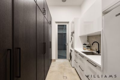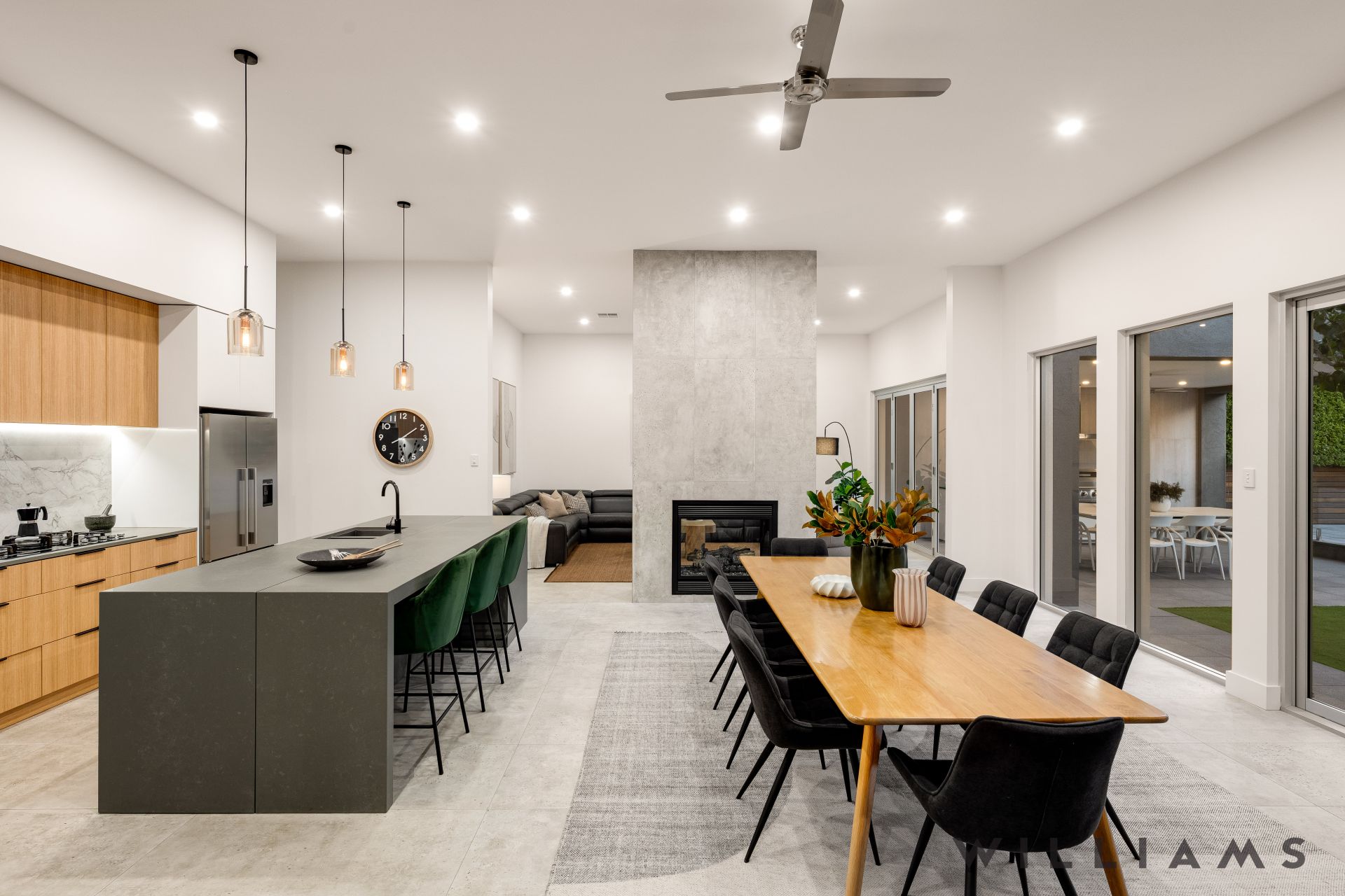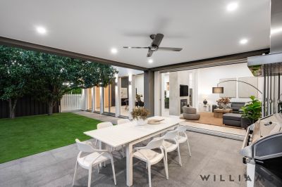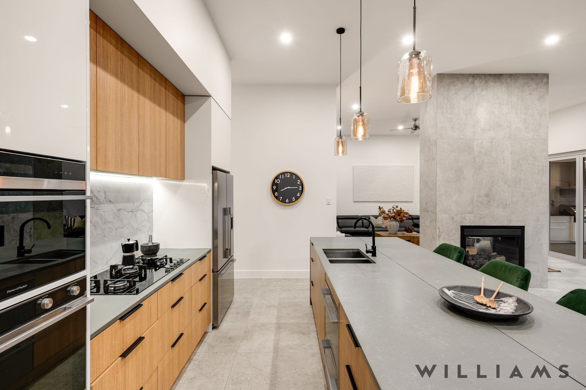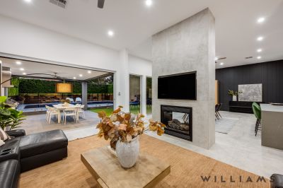 The heart of the home is the expansive open-plan kitchen, living, and dining area, where contemporary design meets everyday functionality. An extensive walk-in pantry, stone benchtops, seamless marble splashbacks, and premium Fisher & Paykel appliances are paired with soft under-cabinet lighting and a dramatic double-sided gas fireplace, creating an inviting space for both entertaining and relaxed family living. Large glass stacking doors open effortlessly to the outdoors, enhancing the home’s exceptional indoor–outdoor flow perfect for year-round entertaining.
