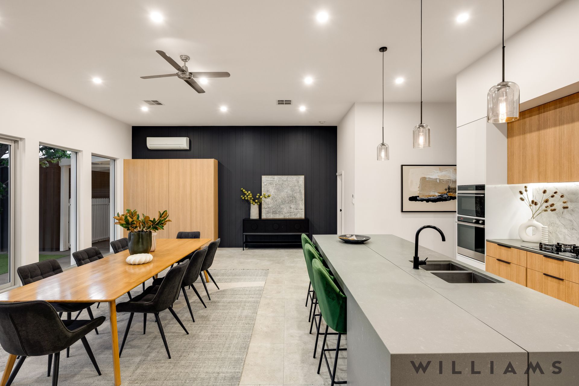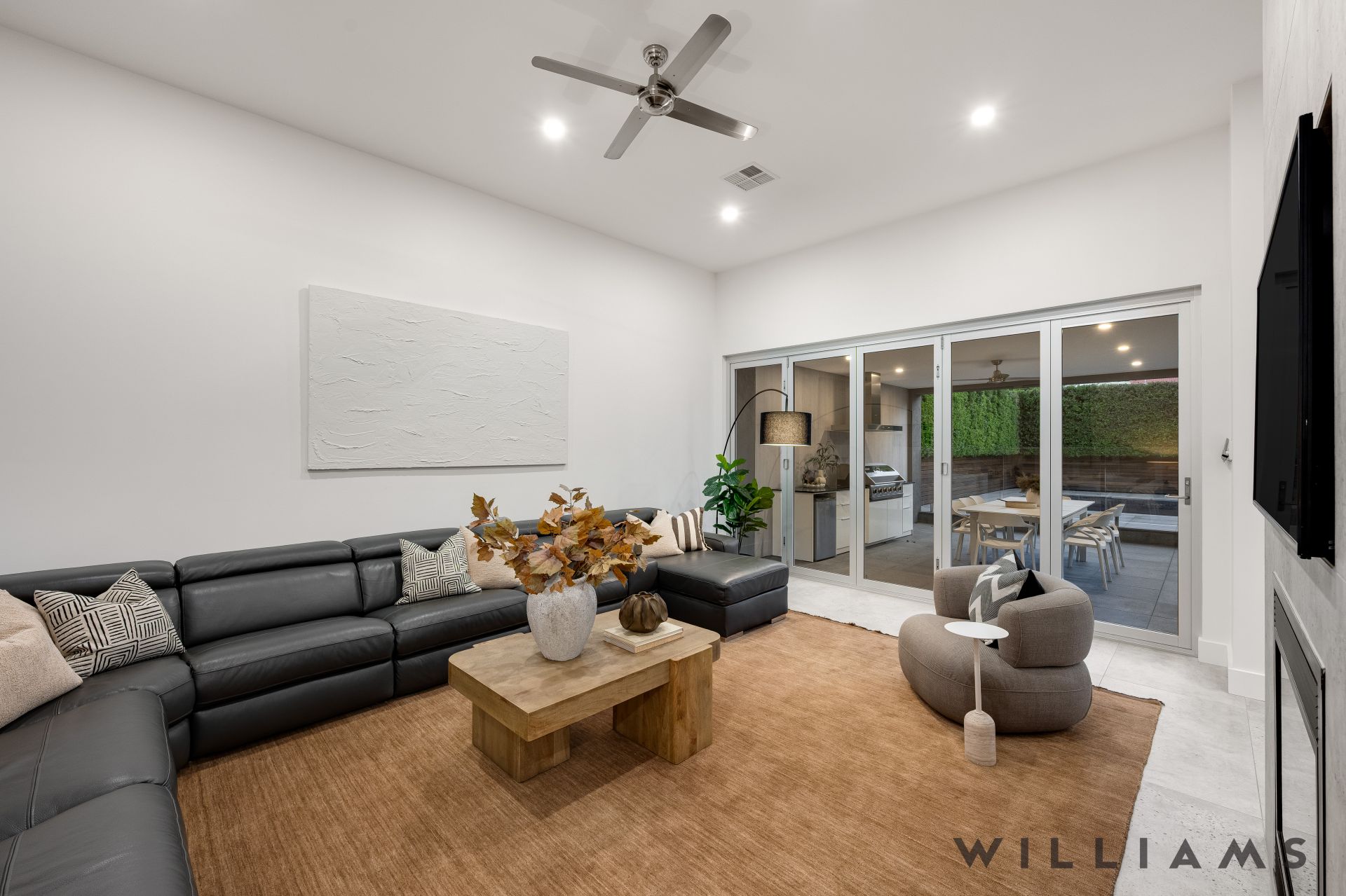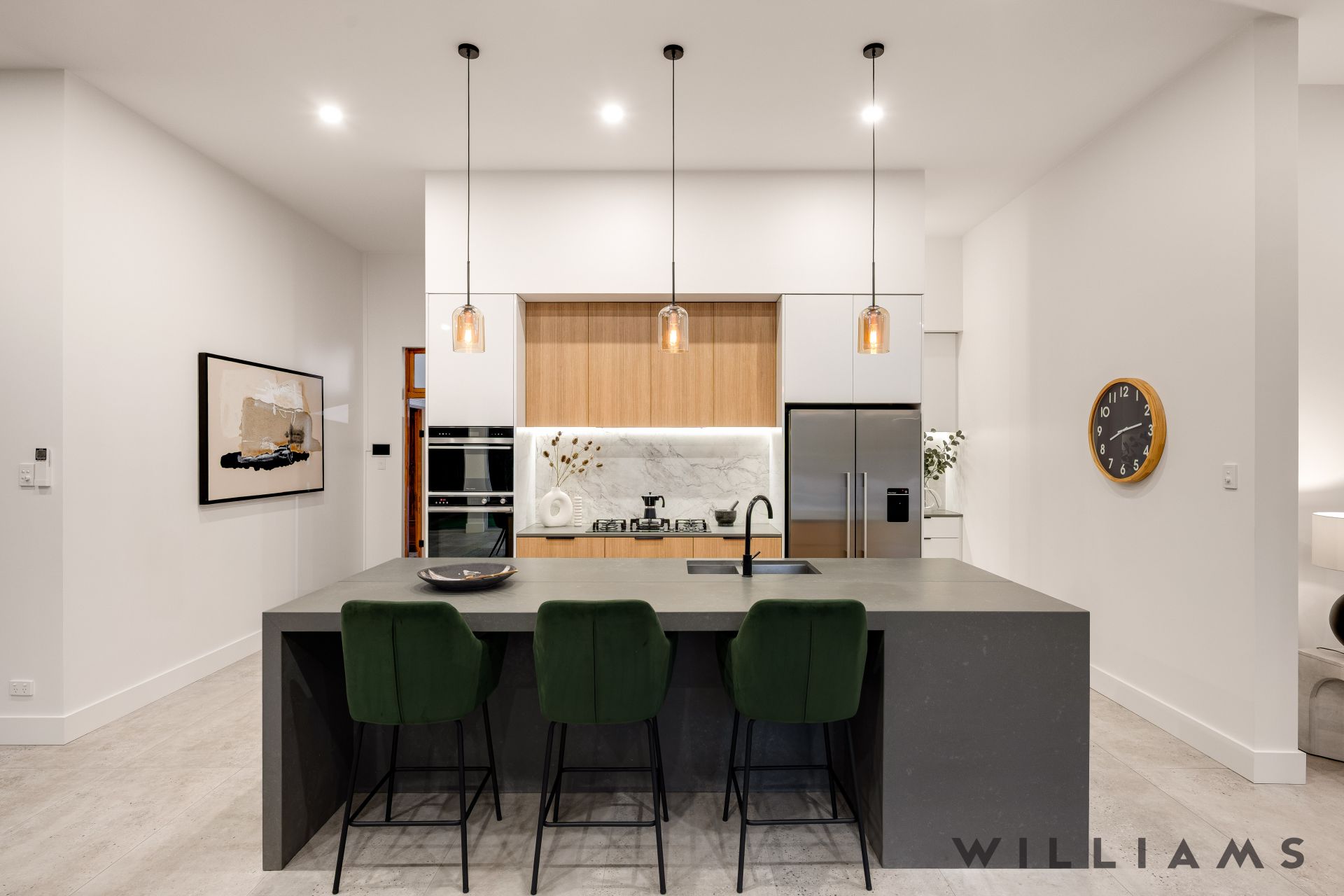 The heart of the home is the expansive open-plan kitchen, living, and dining area, where contemporary design meets everyday functionality. An extensive walk-in pantry, stone benchtops, seamless marble splashbacks, and premium Fisher & Paykel appliances are paired with soft under-cabinet lighting and a dramatic double-sided gas fireplace, creating an inviting space for both entertaining and relaxed family living. Large glass stacking doors open effortlessly to the outdoors, enhancing the home’s exceptional indoor–outdoor flow perfect for year-round entertaining.