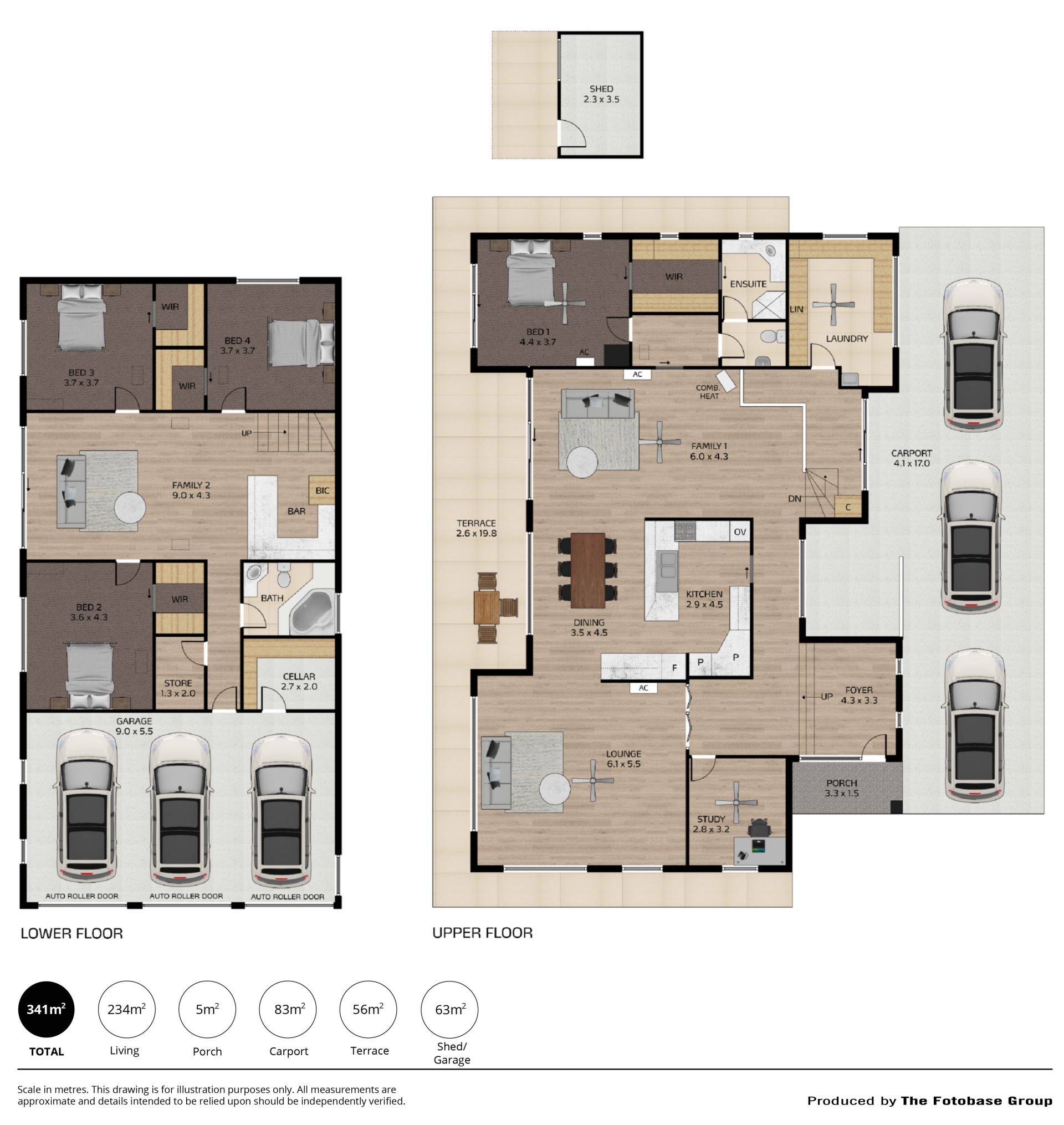 • Upper Level: spacious lounge with raked ceilings, open plan kitchen, dining and family room, master bedroom suite, large outdoor terrace