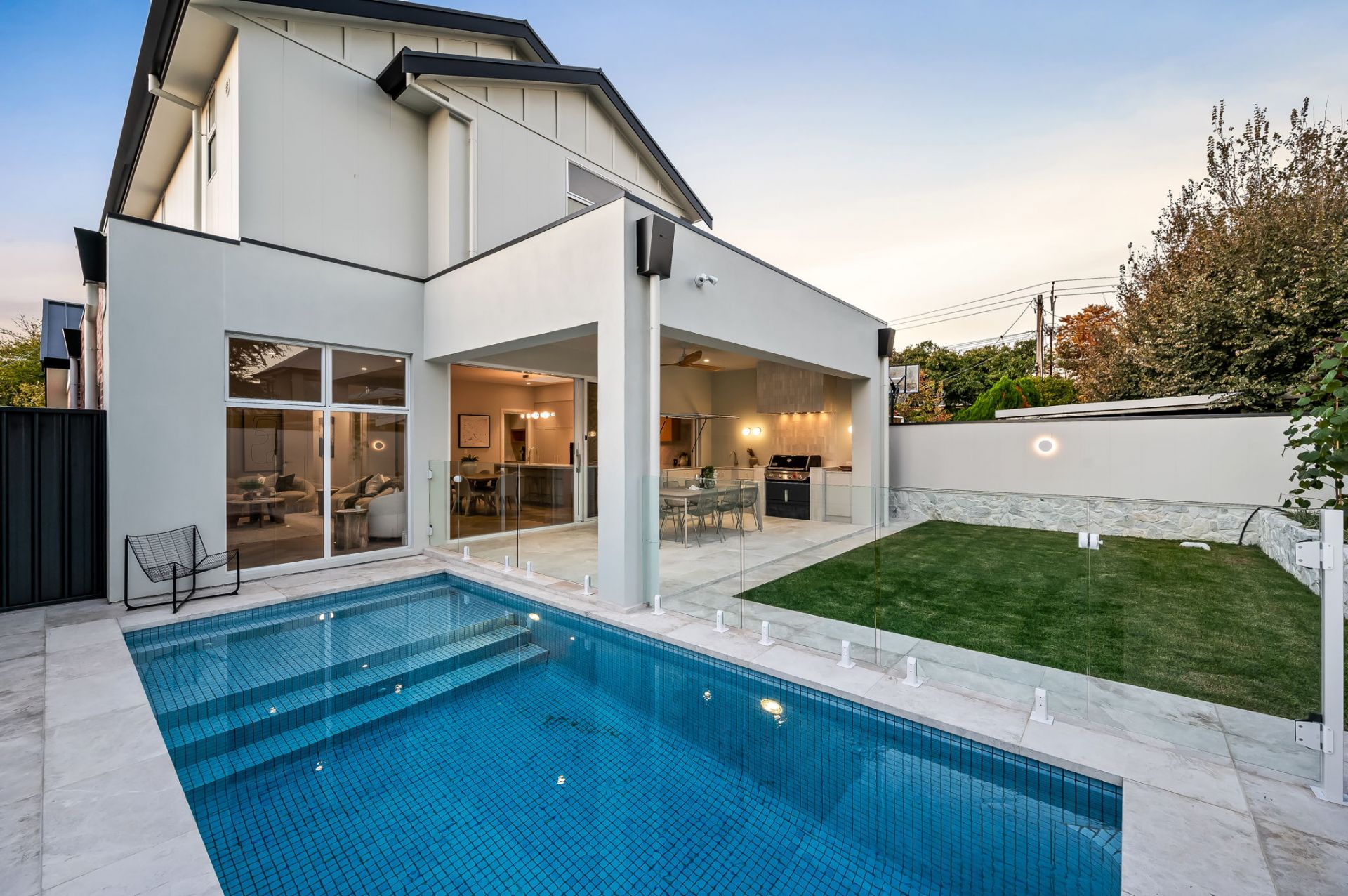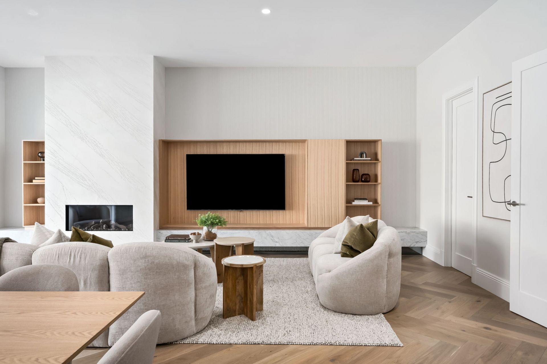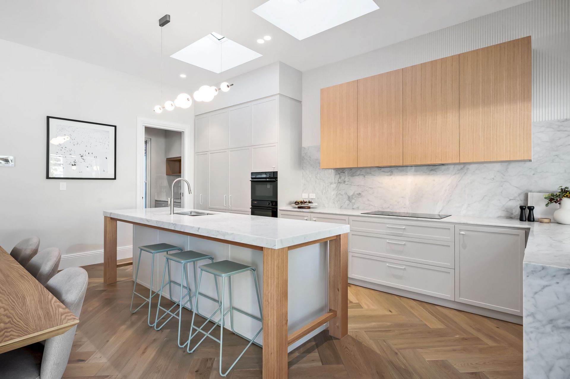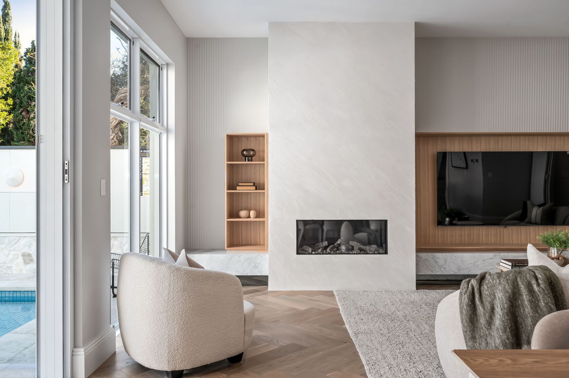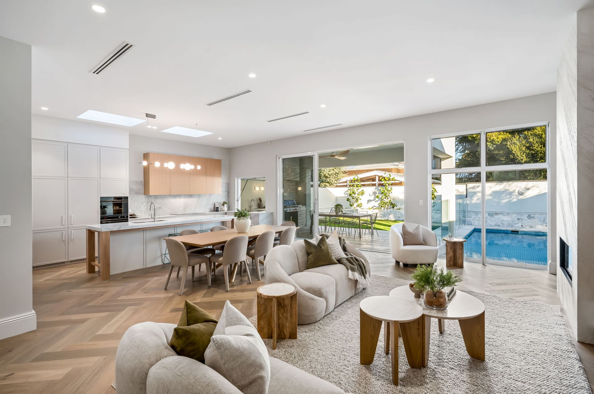 Architecturally designed, the home is set over two thoughtfully curated levels, featuring multiple living areas ensuring maximum comfort and enjoyment, while embracing a contemporary aesthetic of a warm neutral palette thanks to the sumptuous interior designed fit-out including European Oak herringbone floors, Carrara marble surfaces, elegant built in cabinetry and custom designed tiles.