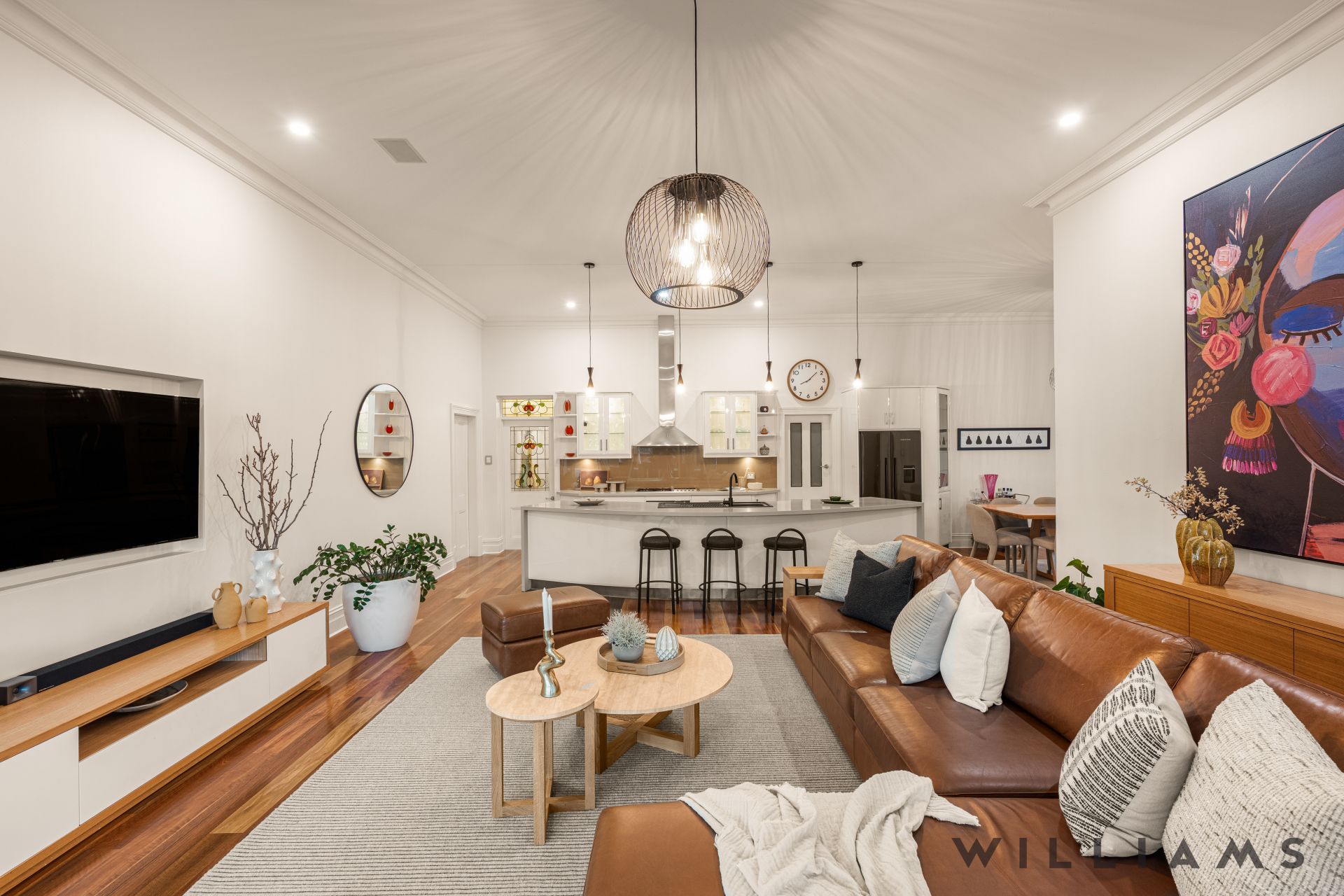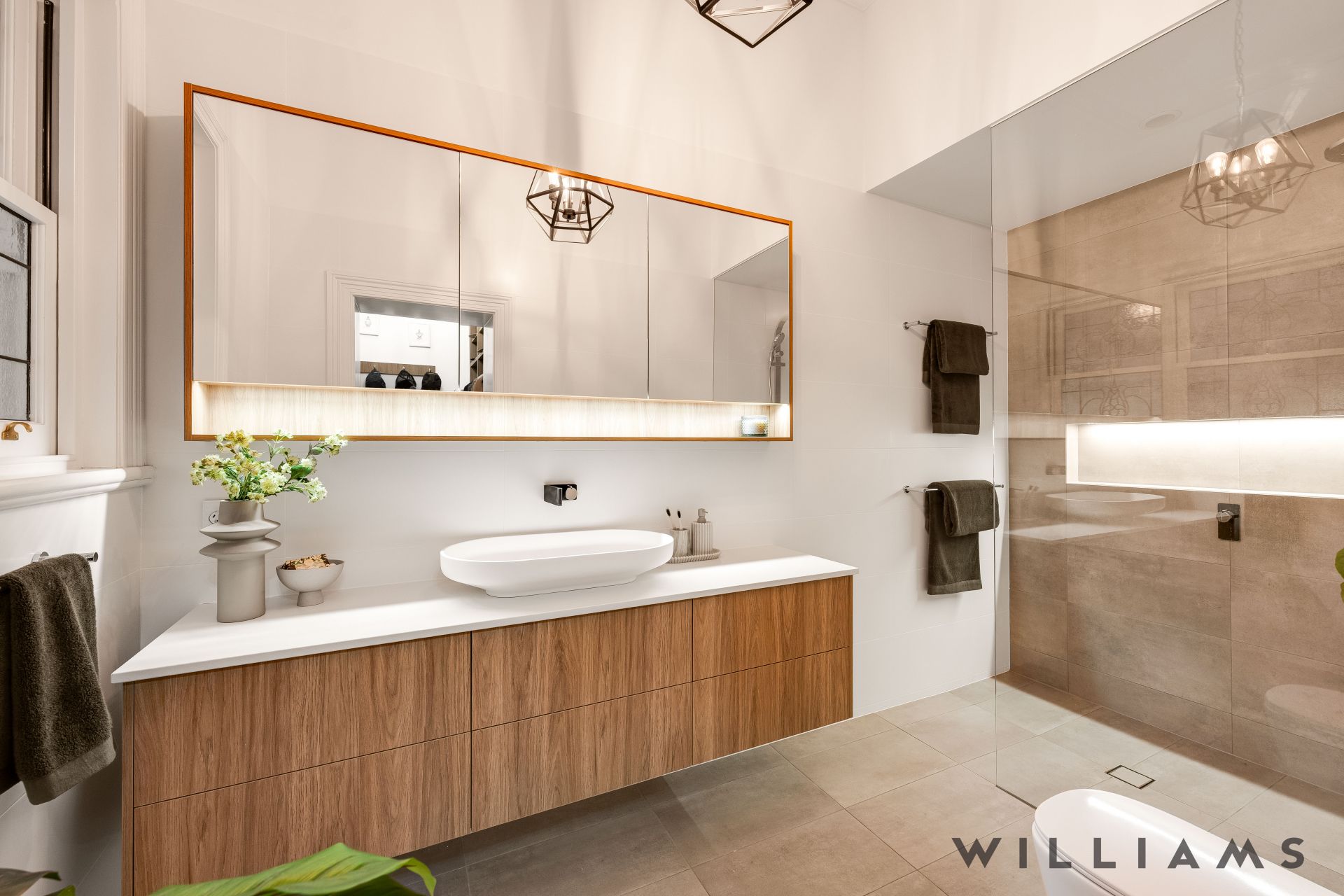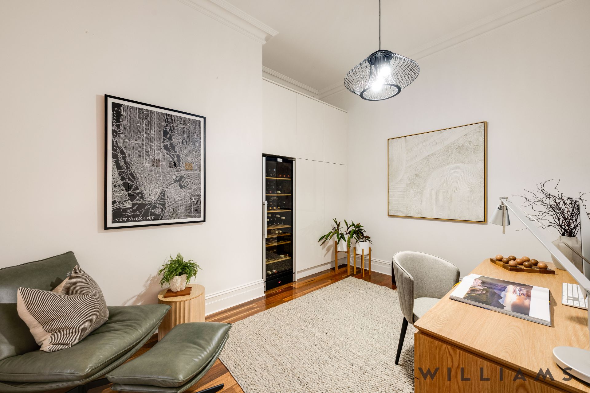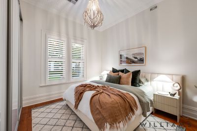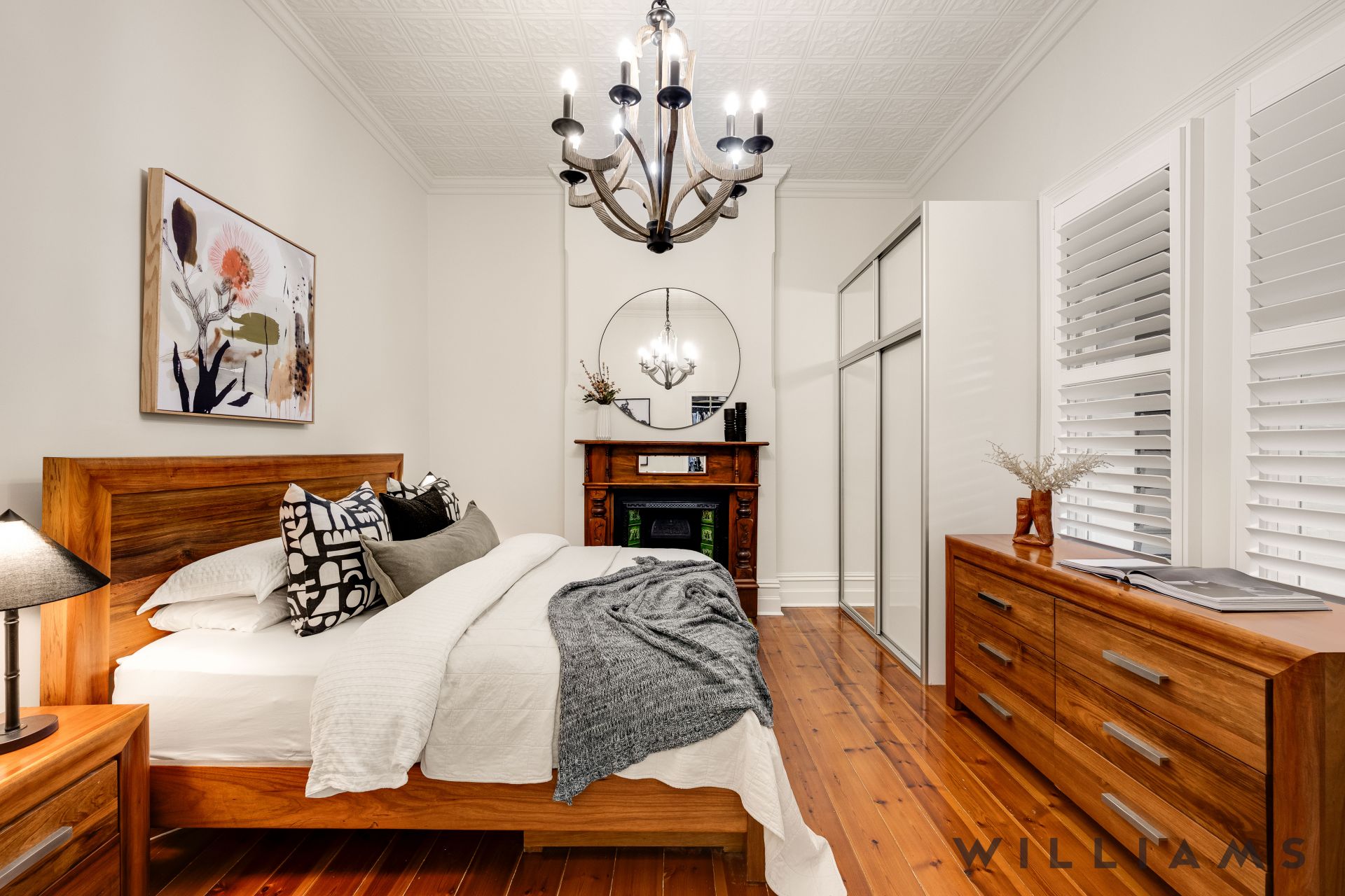 Inside, pressed metal ceilings and decorative fireplaces halo the home's original rooms, with plantation shutters throughout. The couple's wing overdelivers on storage, adding a dressing room transit to the ensuite; a chic addition blessed with under-floor heating.