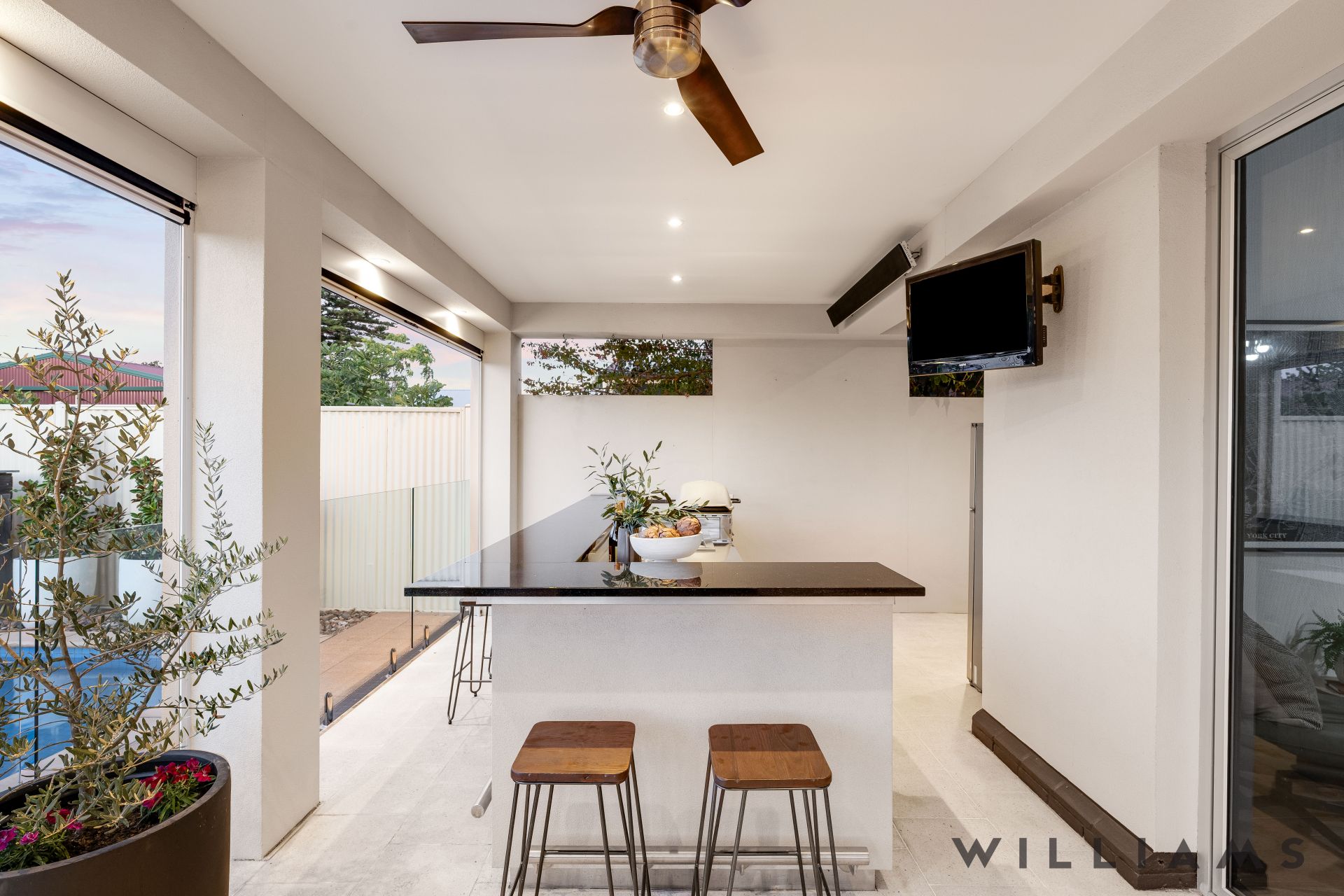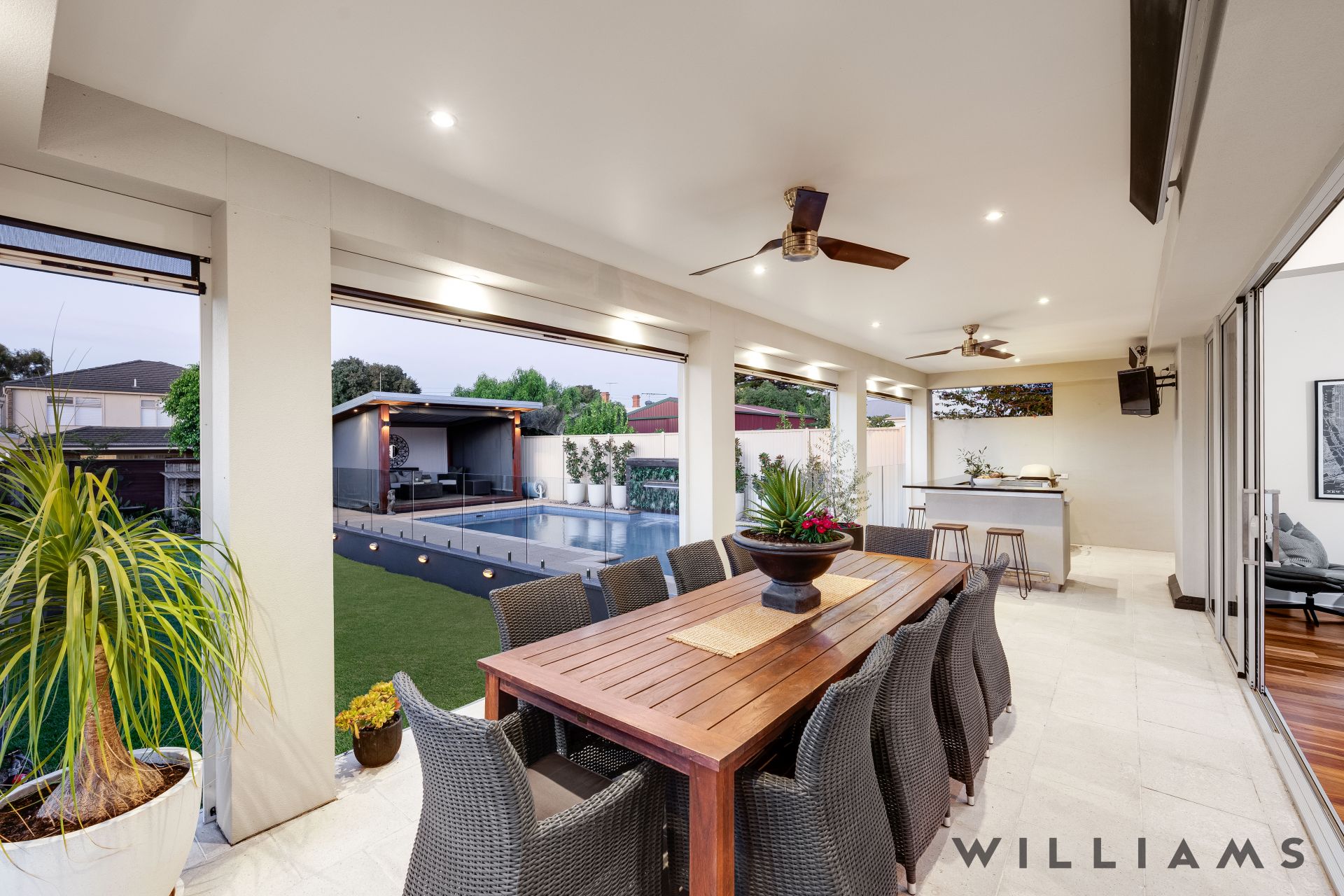 Primed for pool supervision, the alfresco stages a granite-topped inbuilt kitchen with Heatlie and Weber BBQs, Ziptrack blinds, ceiling fans and heat strips – making it every inch the all-seasons indoor-outdoor haven, in compliance with the cleverly curated backyard.