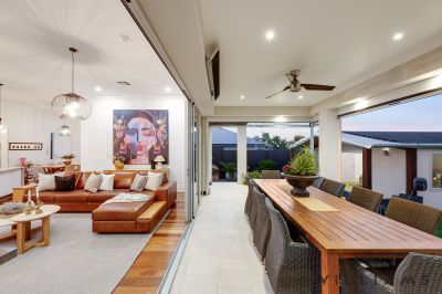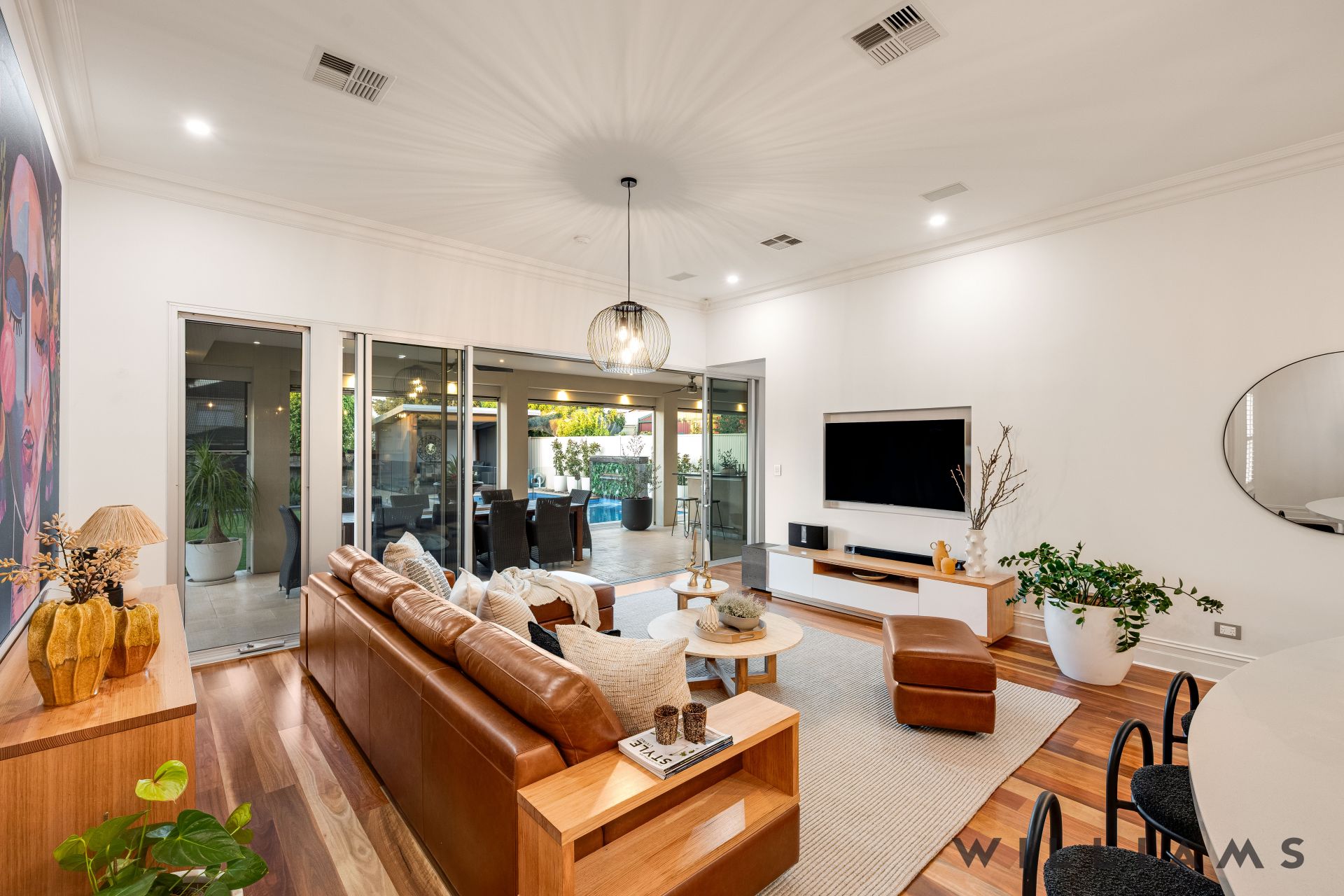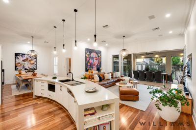 Polished hardwood floors glide beneath the 3.4m ceilings that crown the north-facing family room. The sweeping stone island declares how social this JAG kitchen is, hosting a walk-in pantry, quality appliances, semi-integrated Bosch dishwasher, and viewing rights over the living space and pool.