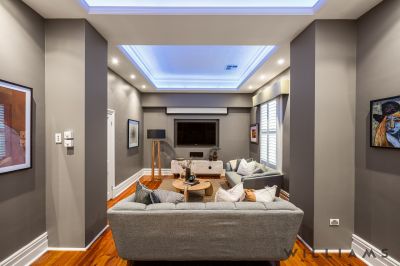 The central cinema lounge is movie marathon-ready with provisions for front and rear surround sound, beneath ambient LED-lit coffered ceilings; custom 2-pac joinery throughout ensuring display and practical storage is covered.