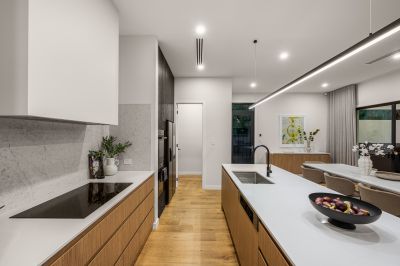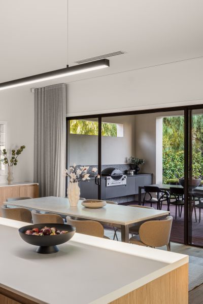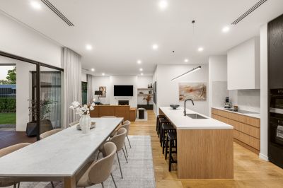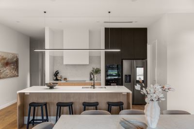 The kitchen is exceptional – a perfect blend of sophistication and functionality, appointed with premium Miele appliances including double pyrolytic ovens and an induction cooktop. Stone surfaces including a generous breakfast bar, it is further complemented by a fully equipped butler's pantry designed to discreetly house everyday appliances. Thanks to full length windows, streams of natural light illuminate the adjacent family dining and living areas, drawing views outward to the alfresco and private rear garden.