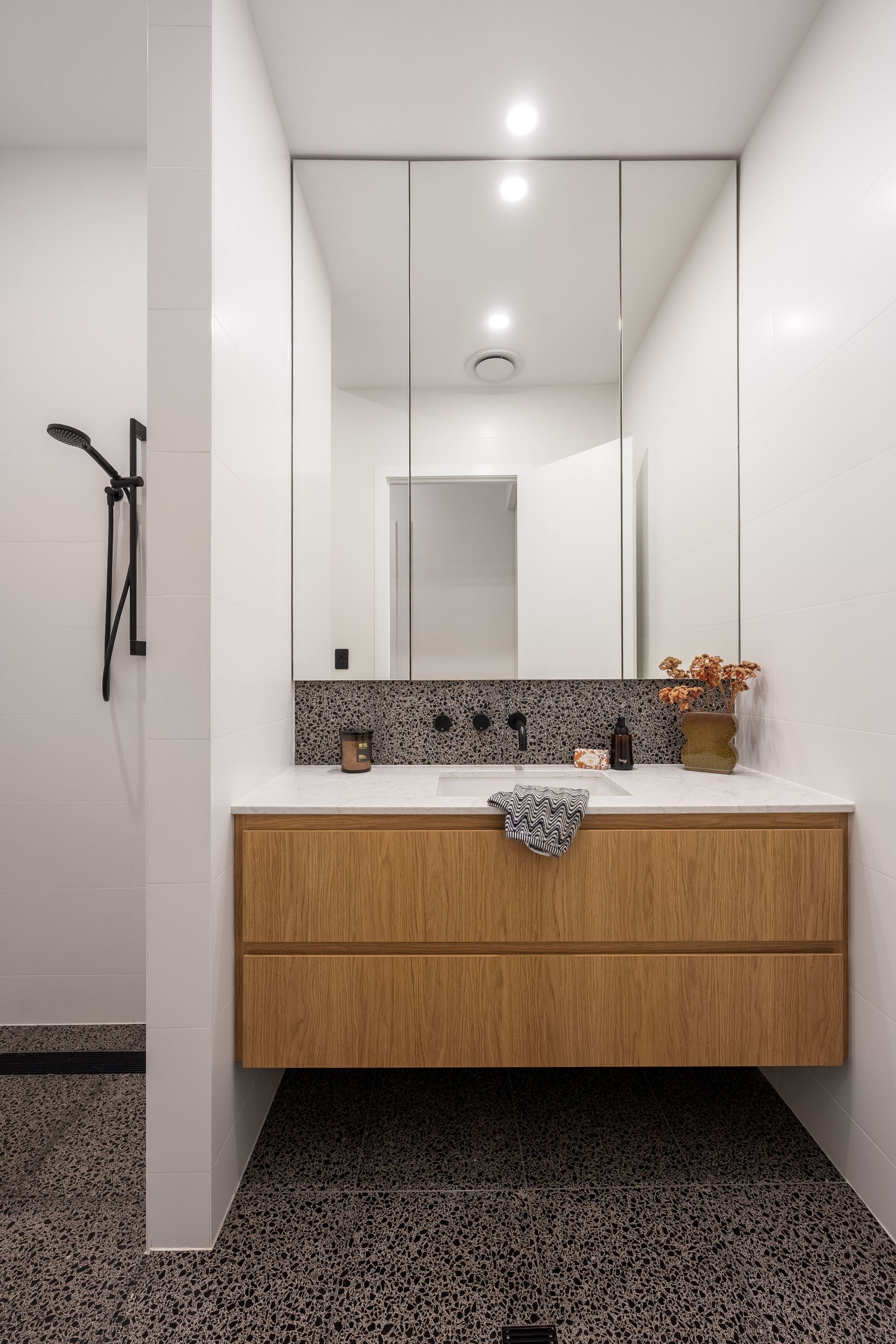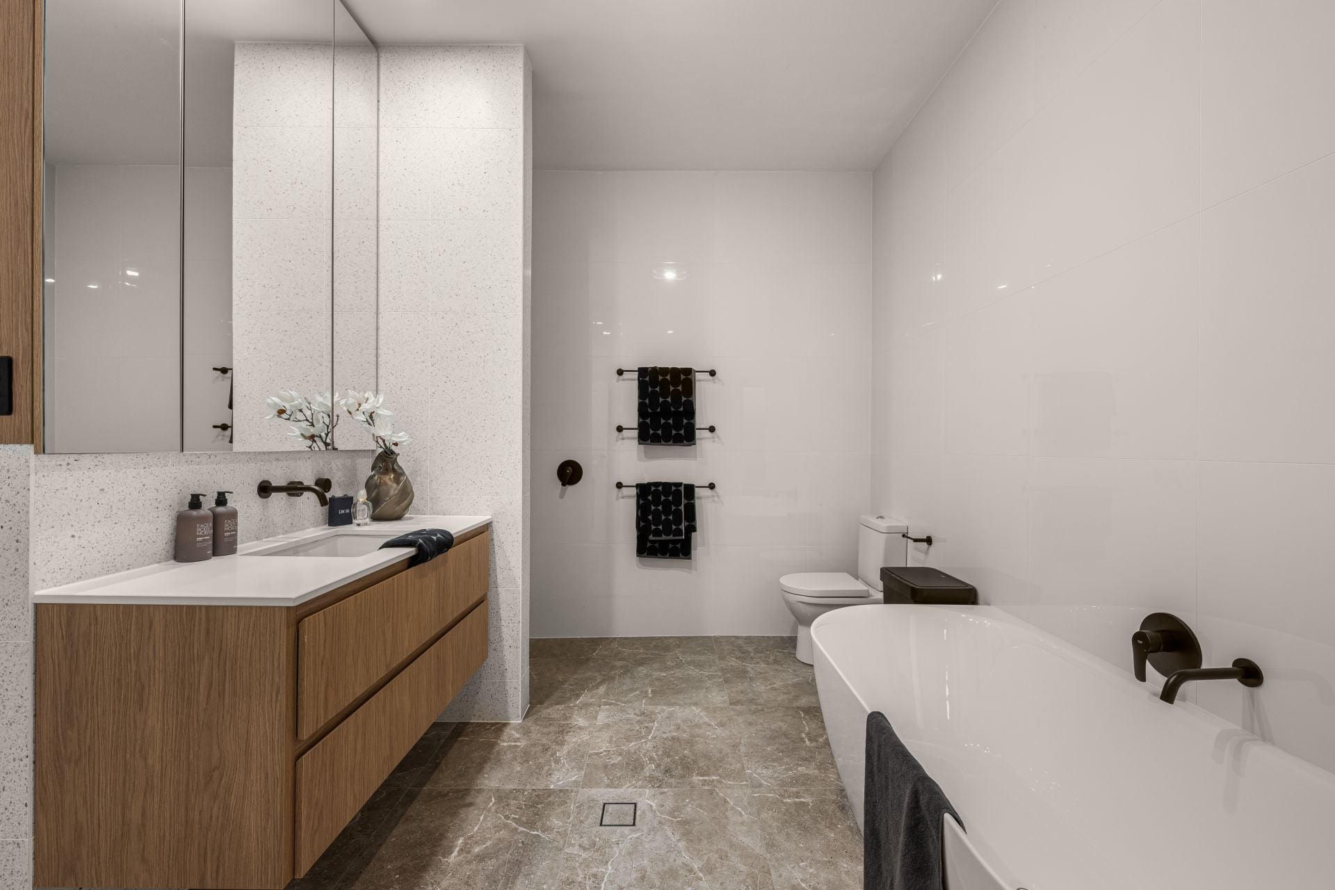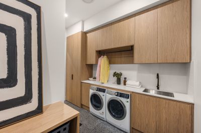 Accommodation and living spaces throughout are both flexible and generous. Currently configured as four bedrooms, the home can easily adapt depending on your needs. The master bedroom suite offers a walk-in robe and luxurious ensuite complete with free-standing bath, terrazzo tiles, feature nib walls and integrated joinery. Equally impressive are the beautifully appointed powder room and main bathrooms, ensuring effortless functionality and convenience for family and guests.