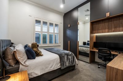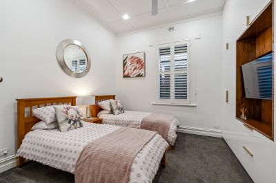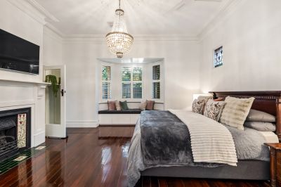 A graceful formal living room flows seamlessly into an adjoining study, four generously sized double bedrooms, equipped with custom built in cabinetry including desks and full height robes. The main bedroom is nothing short of a retreat, retaining the charm of the original ceiling, feature leadlight windows, fireplace, and full ensuite bathroom and walk in robe and a bay window providing a tranquil space for peaceful relaxation.
