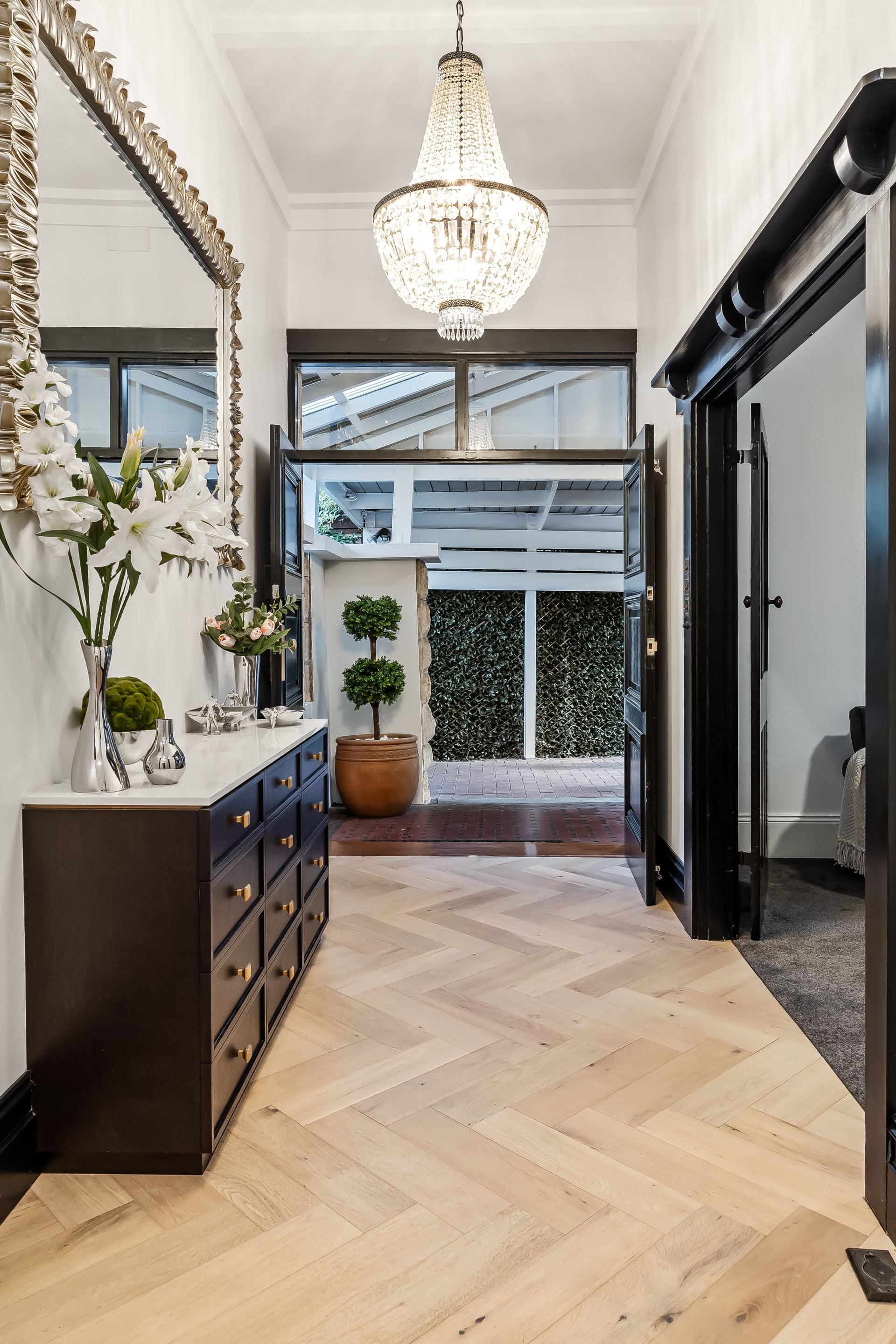 Step inside through a wide entrance where dual entry doors welcome you to discover soaring ceilings, stunning leadlight and gorgeous Herringbone timber flooring that are the hallmarks of this stunning home.